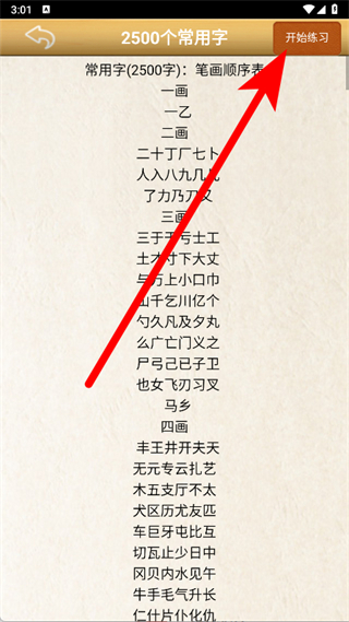 3、进入字帖内容页面后,点击开始练习按钮,进入练字环节。
