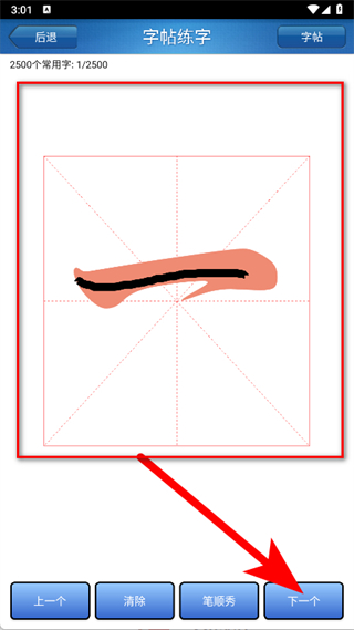 4、在字帖练字页面,根据显示的笔画练习写字,练完当前字后,点击下一个按钮,继续练习。