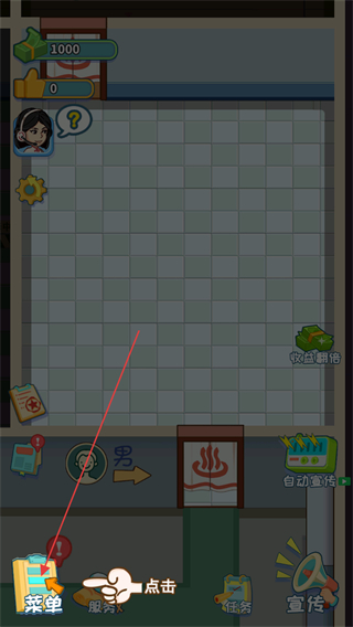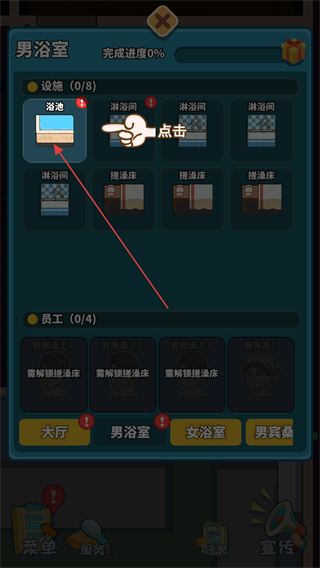 4、设施解锁后,等待客人进入浴室消费,可通过自动宣传等功能吸引更多客人。