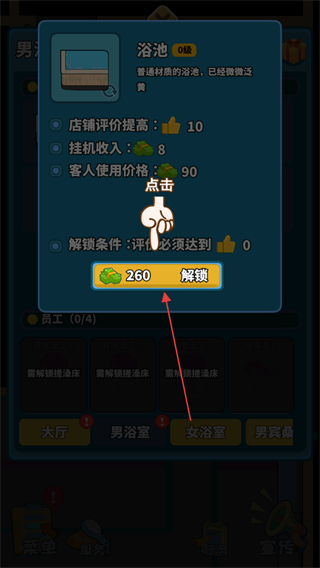 3、查看浴池解锁条件,消耗260个对应资源点击解锁来获取该设施。