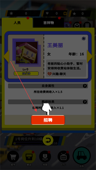4、在藏品界面选中角色,如王美丽,点击招聘将其安排到收费岗位,提升收费站收益。