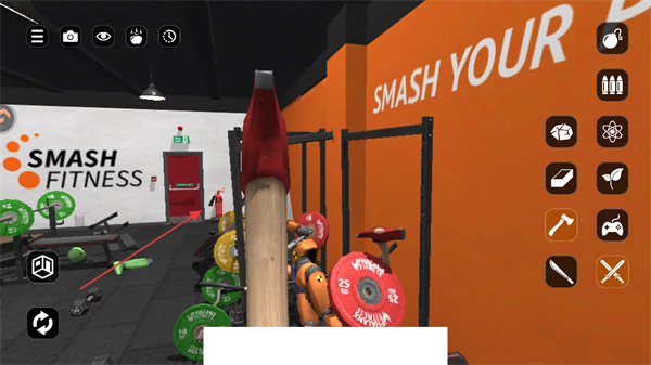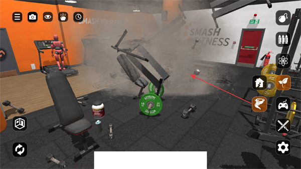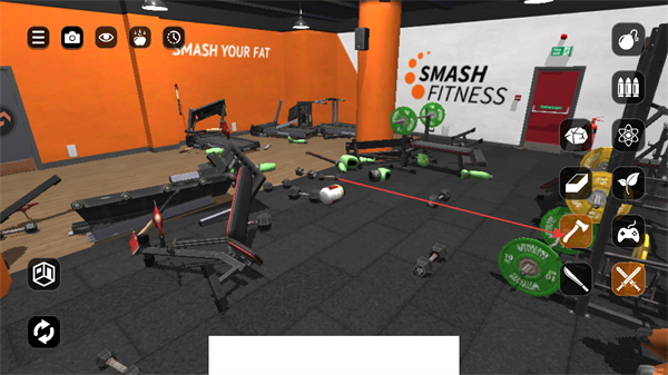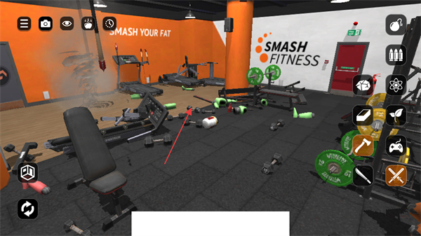2、持续使用道具对健身房内各类物品,如哑铃、杠铃等,进行肆意砸击,制造混乱场面。