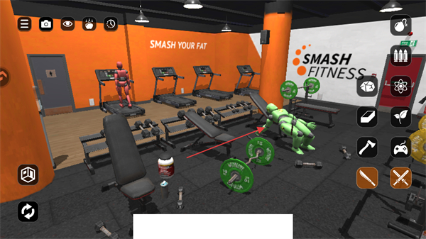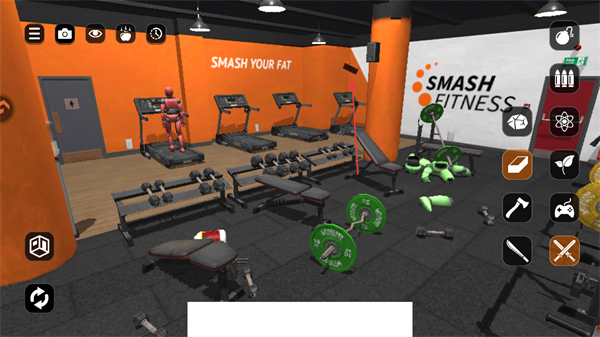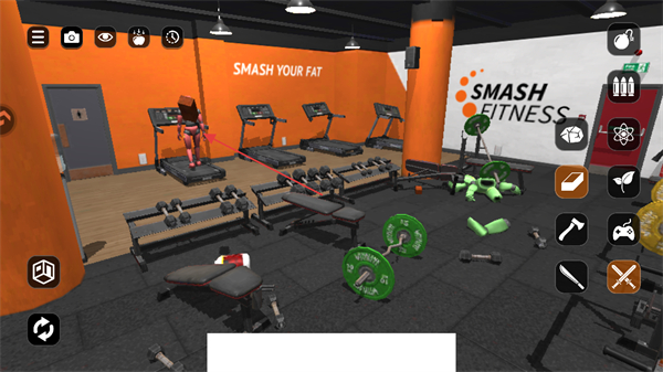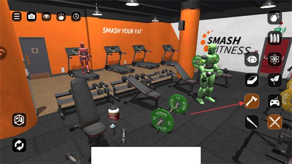 1、进入游戏,看到健身房场景,右侧有工具图标,点击工具图标准备对场景内物体进行操作。