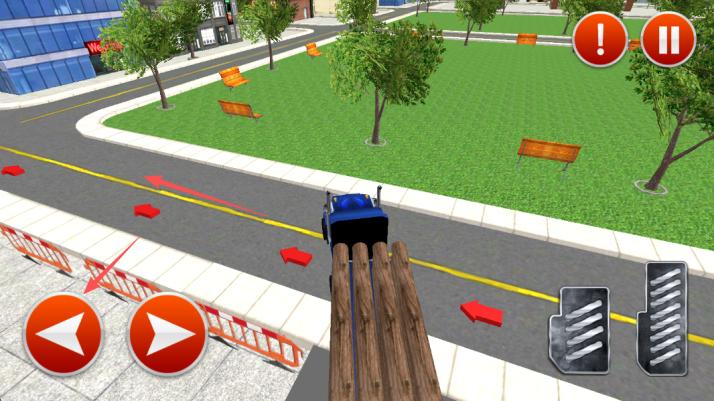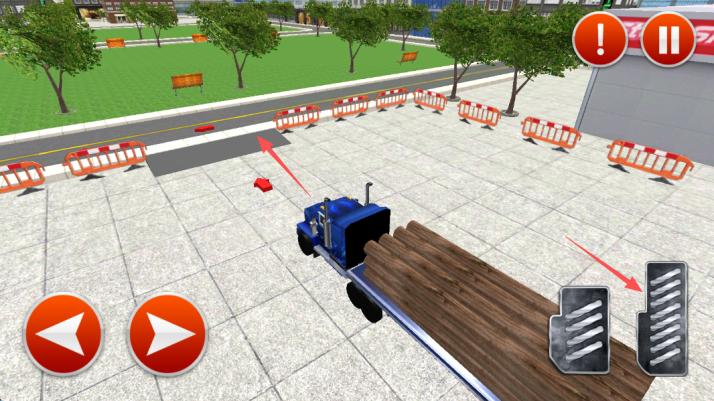1、操控卡车时,沿【红色箭头】方向,利用右侧【加速按键】,朝广场【橙色护栏】区域行驶。