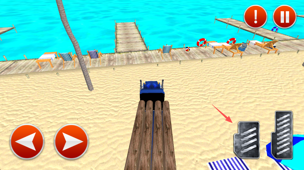 3、抵达沙滩,驾驶卡车沿木栈道,借助右侧按键控速,朝【码头】方向平稳前行。
