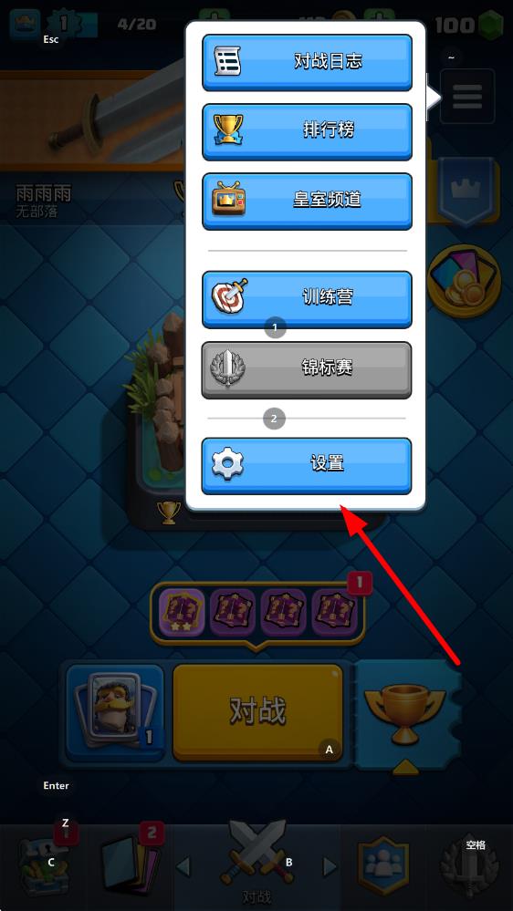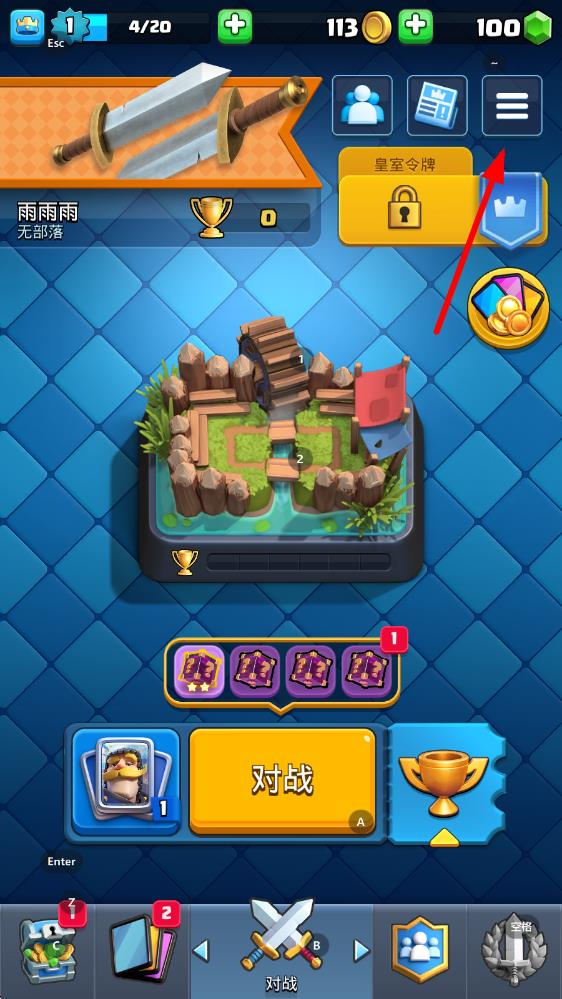 1、打开皇室战争游戏,进入主界面,点击右上角三条横线样式的菜单图标。