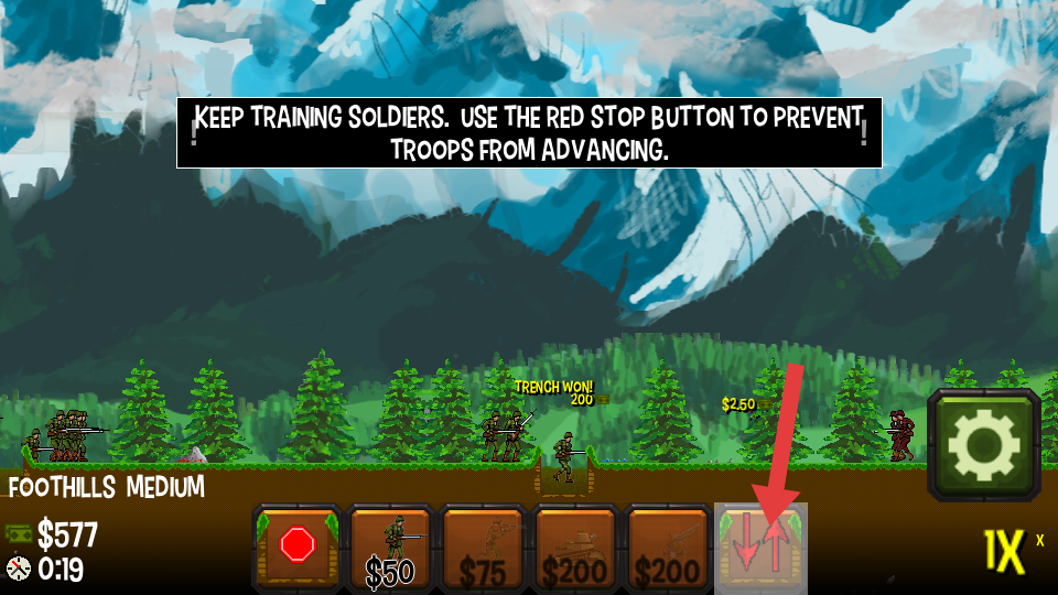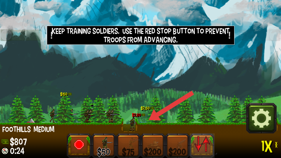 2、依据提示持续点击训练按钮补充兵力,遇敌方压力时,点击红色按钮控制部队推进节奏,维持平衡。