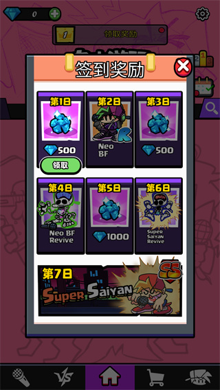 4、通过每日签到可以获得奖励,第一日获得500钻石、第二日解锁新角色、新三日获得500钻石、第四日解锁新角色,以此类推,第七日解锁终极SS级角色大奖。
