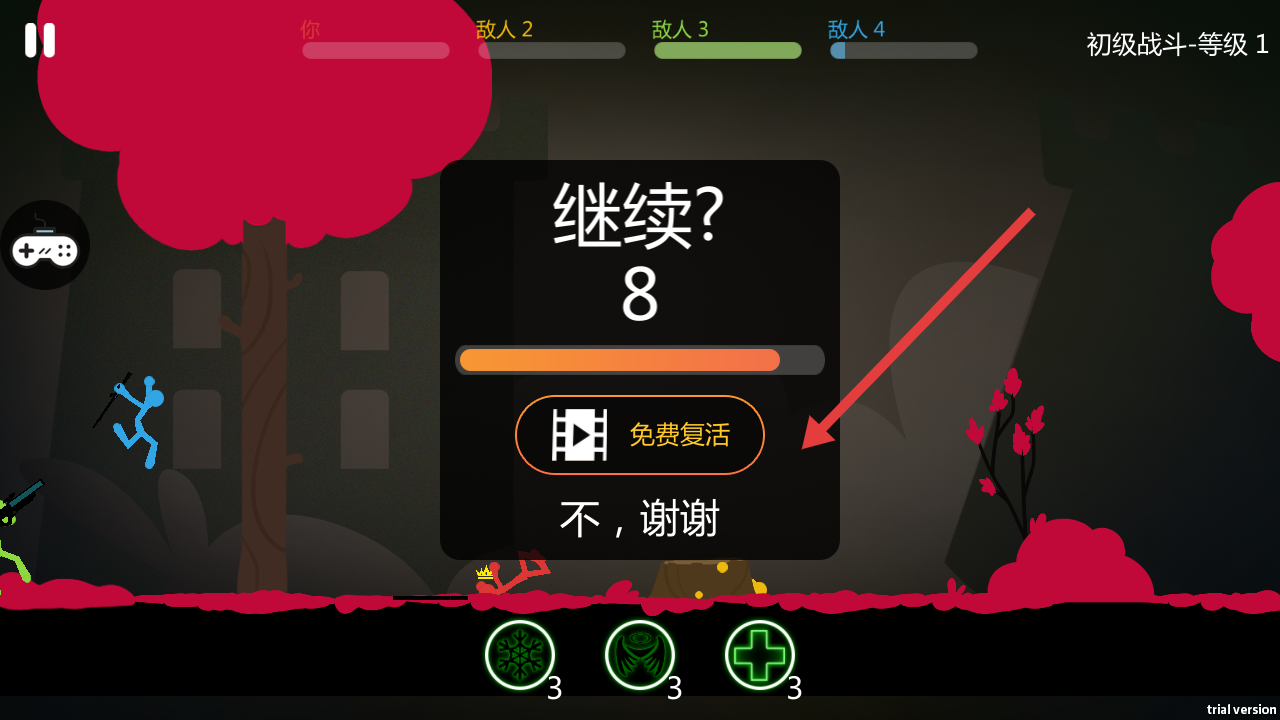 3、若战斗失败,会弹出继续提示框,可选择免费复活观看视频复活继续战斗,也可点击不,谢谢结束本局。