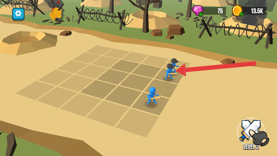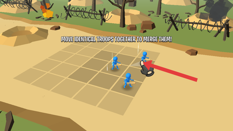 1、在首图方格布阵区,依据提示用手指拖动相同的蓝色基础士兵,让他们移动并重叠,完成合并升级,提升部队战力。