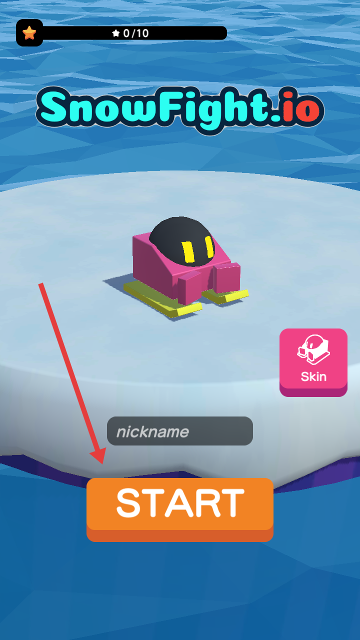 1、点击START进入SnowFight.io,通过双环虚拟摇杆,操控粉色载具在冰面移动,同时收集雪球。