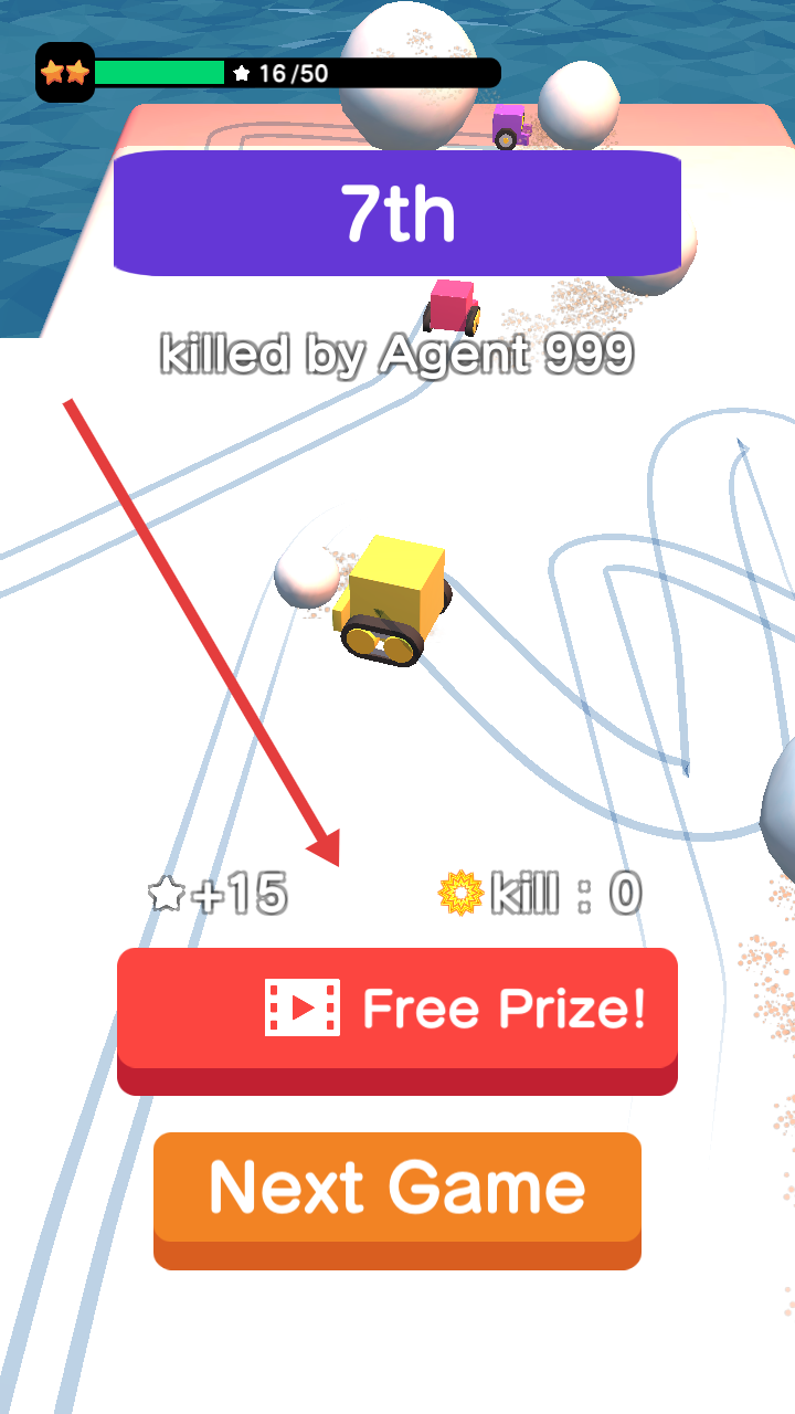 3、失败或存活后,点击Next Game重开,或看广告领Free Prize,积累星星提升排名解锁皮肤。