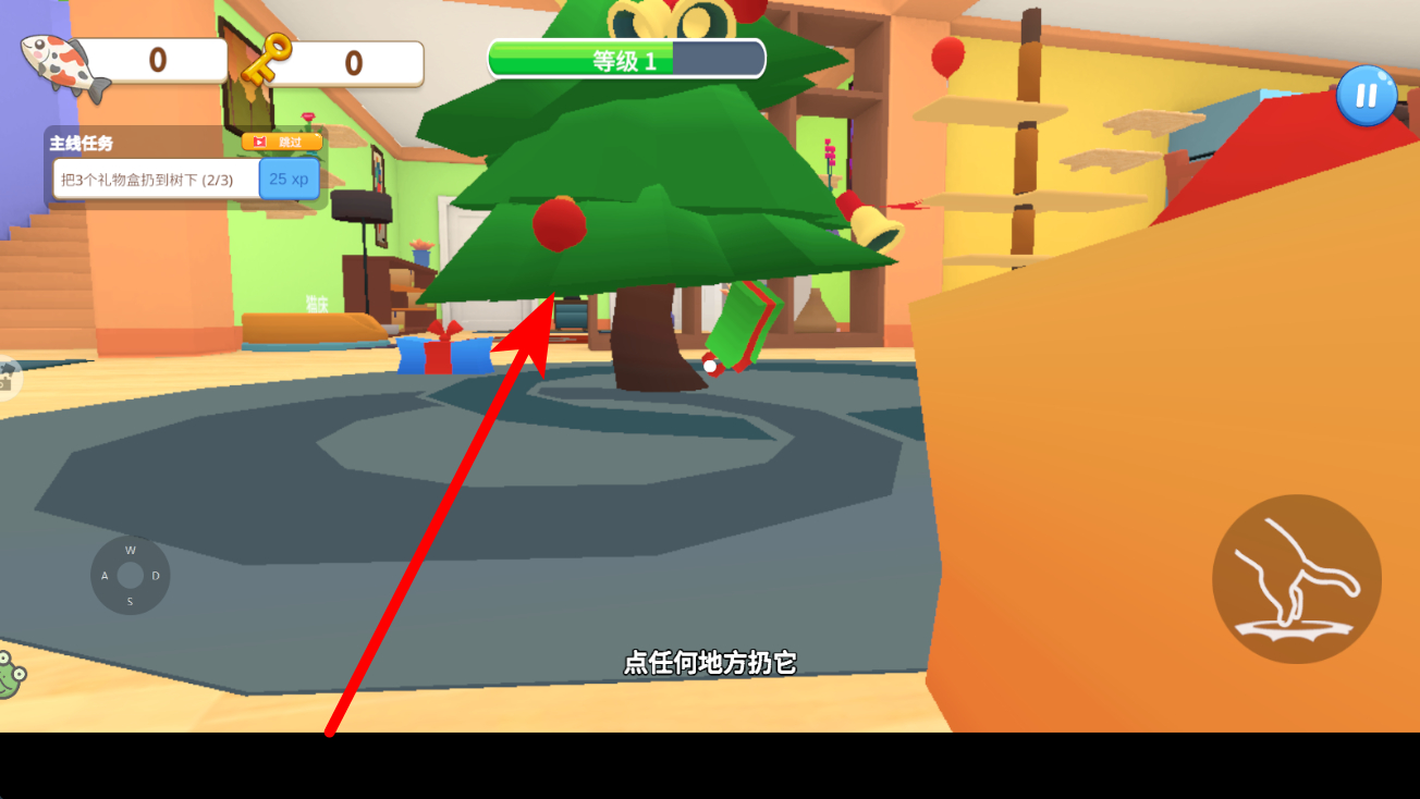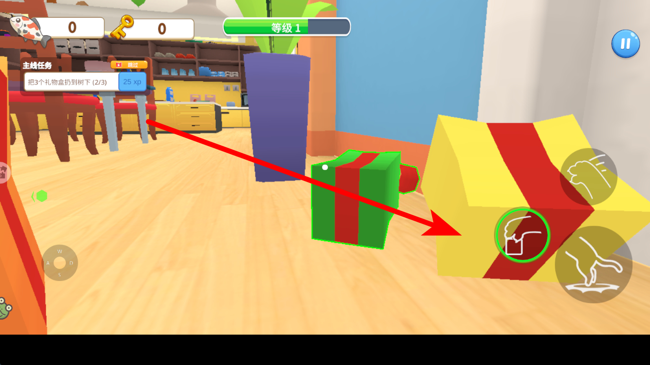 2、依据任务提示,如向圣诞树扔任意物品,在场景拾取礼物,移动靠近,点击投掷按钮,将物品投向树下,完成对应投掷任务,推进进程。