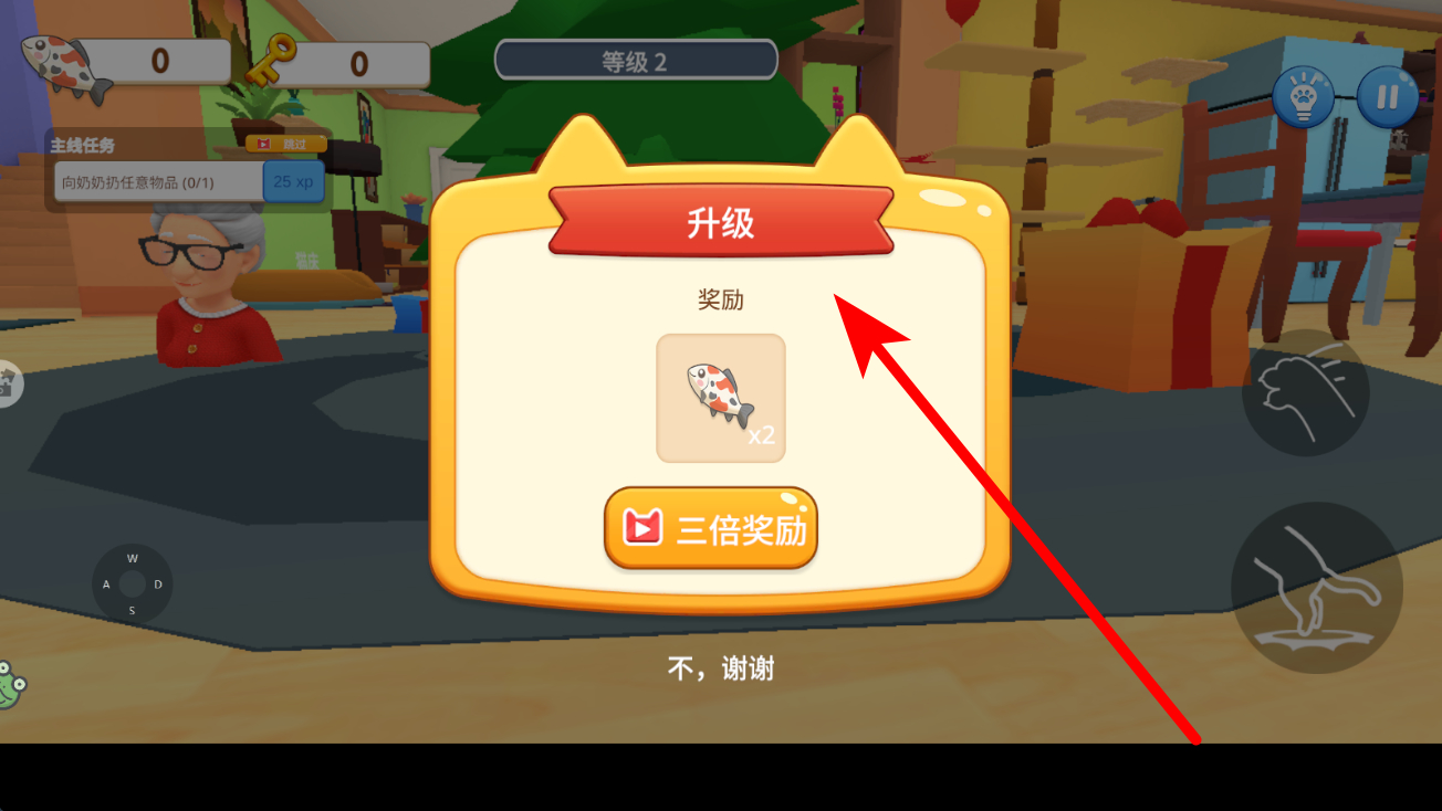 3、完成任务积累经验后,弹出升级提示,可选择领取小鱼奖励或三倍奖励,领取奖励后等级提升,解锁新任务与内容,持续拓展游戏体验。