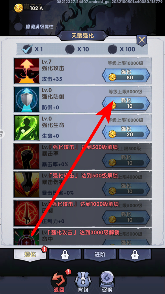 2、进入天赋强化界面后,可以挑选强化攻击防御等天赋,消耗金币进行强化,精准提升对应属性,可以显著增强角色战斗能力。