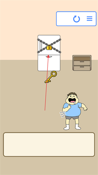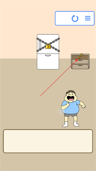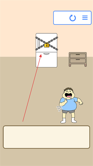 1、进入关卡,看到被锁链和锁封住的冰箱,以及旁边的柜子,明确目标是帮人物吃到冰箱里的食物。