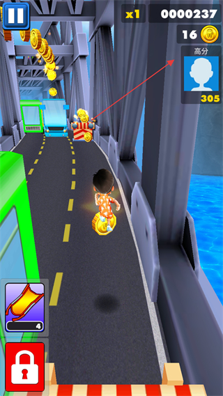 4、在桥上路段,关注右上方高分记录,操控角色左右移动收集金币,挑战更高分数。