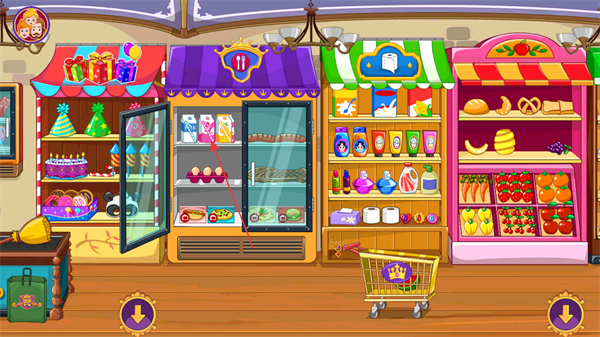 2、点击冰柜等货架打开柜门,露出里面的蛋糕、肉类等商品。