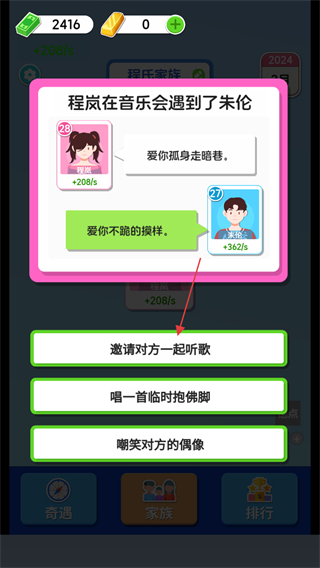 1、在游戏中遇到新人物触发对话,如程岚在音乐会遇到朱伦,点击邀请对方一起听歌来增进关系。