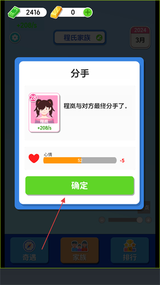 2、若选择不当行为导致分手,如出现分手提示,点击确定确认关系结束,留意心情值变化。