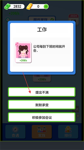 4、遇工作相关事件,根据自身策略点击提出不满等选项,应对工作中的状况。