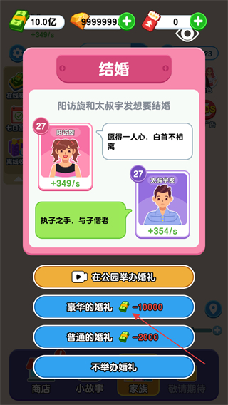 2、进入结婚界面,若决定结婚,可选择豪华的婚礼等不同档次婚礼并支付对应费用。