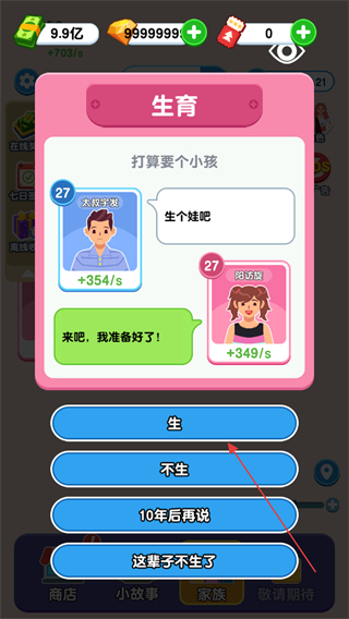 4、出现生育选项时,根据意愿点击生等按钮,决定是否生育小孩。