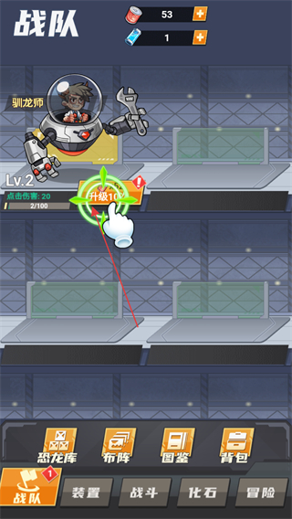 4、利用恐龙库,布阵等菜单功能,管理恐龙、优化阵容,推进冒险。