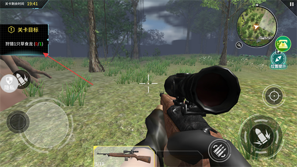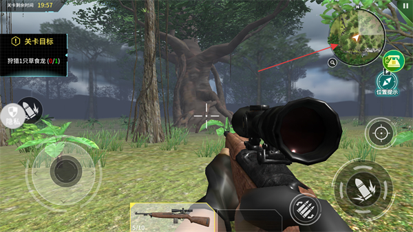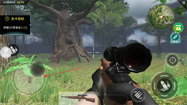 2、利用左下方虚拟摇杆移动,在森林场景中搜索草食龙踪迹,注意隐蔽。