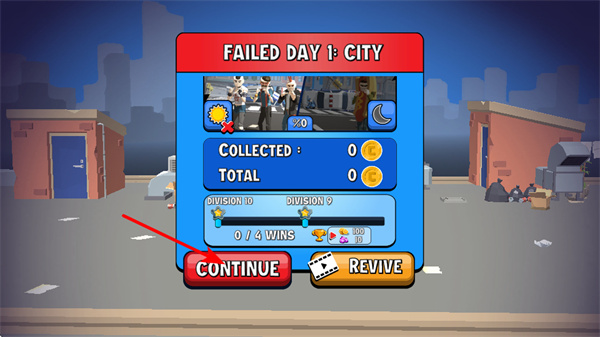4、游戏失败后,点击红色CONTINUE按钮可继续游戏,快速回到挑战进程中。