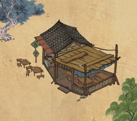 包子铺与米铺相邻,左侧有颗柿子树,寓意事事如意。铺子的外形非常的简约宽敞,所以大家感兴趣的话,可以在游戏中开始这个行当来赚钱哦。
