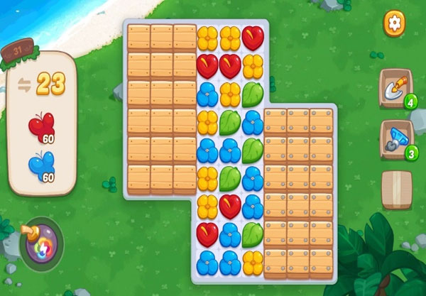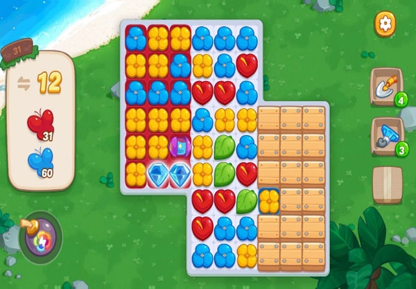 3、.因为掉落的花朵颜色只有三种,所以可以尽可能的收集9个以上的花朵生成钻石,使用组合道具的效果,来消除大片区域,从而使新的花朵可以掉落下来生成蝴蝶。