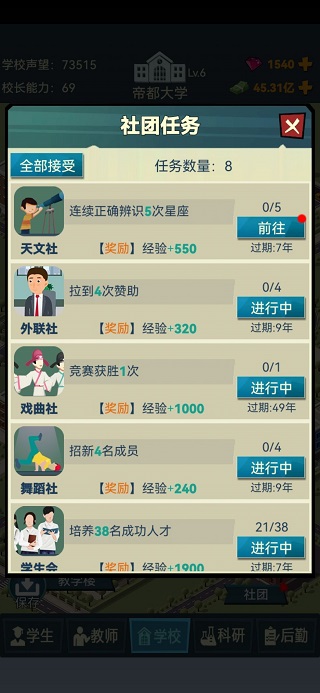 10、社团,不需要花费太多精力在这个上面,任务也不需要搞(国家资助任务可以弄弄),只需要扩建然后造出所有社团让他们自己比赛拿奖升级就行。