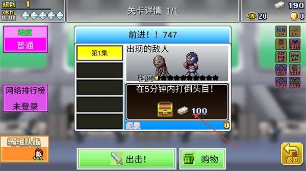 2、查看关卡详情,在5分钟内打倒头目可获宝箱和金币,点击出击开始战斗。