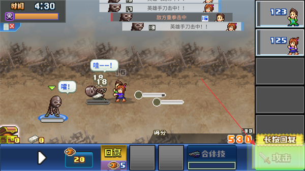 4、在战斗中使用攻击等按键,操控英雄打倒敌人,获取得分,持续战斗直至胜利。