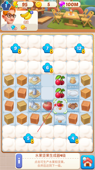 3、水果坚果生成器4级,点击可生产水果和坚果,合并后还能升级。