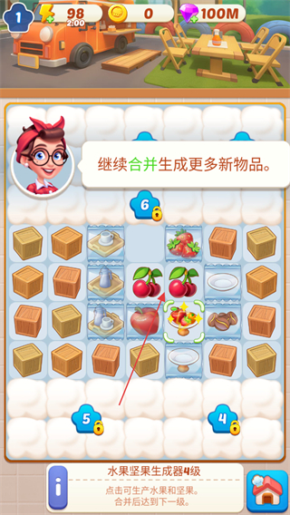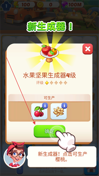 2、新生成器!是水果坚果生成器4级,可生产樱桃、花生,点击确定。