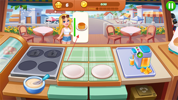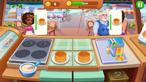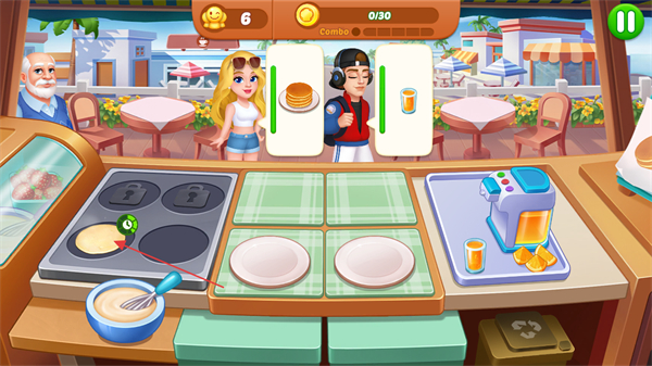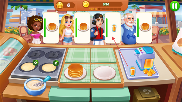 4、制作完成后,及时将食物递给对应顾客,获取金币,同时注意Combo连击数,提高收入。