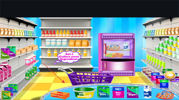 1、进入游戏看到Let'sCollectsomeIngredient提示,准备收集食材,点击食材放入购物车。
