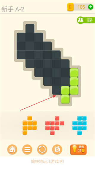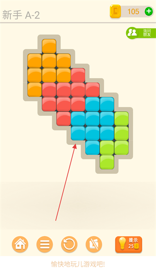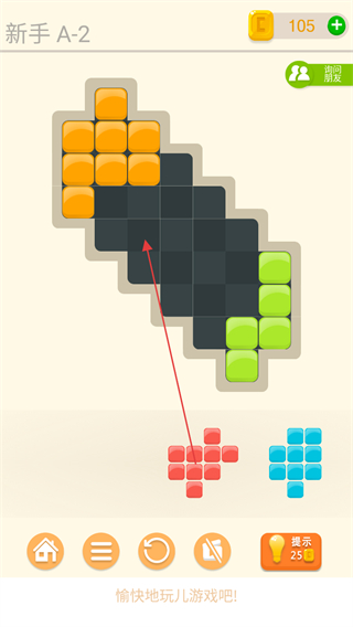 1、观察游戏区域的黑色空格形状,选择下方对应形状的彩色方块如橙色、红色、蓝色方块。