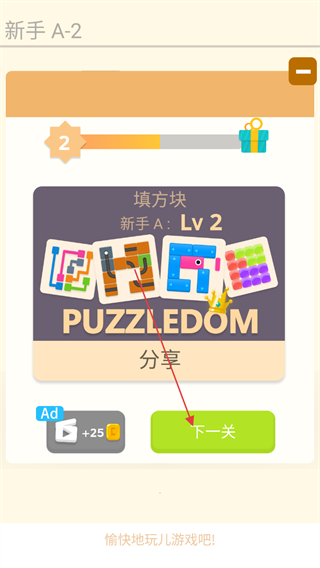 4、完成填充后,即可通关,点击“下一关”继续挑战更复杂的填方块谜题。