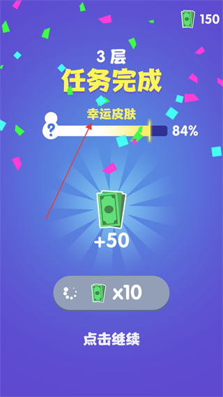 4、完成任务后,获取金币奖励和幸运皮肤进度,点击点击继续进入下一层。