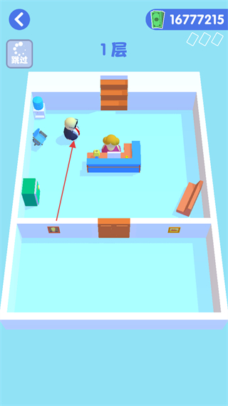 1、在1层操控角色移动,避开人员,收集场景中的物品。