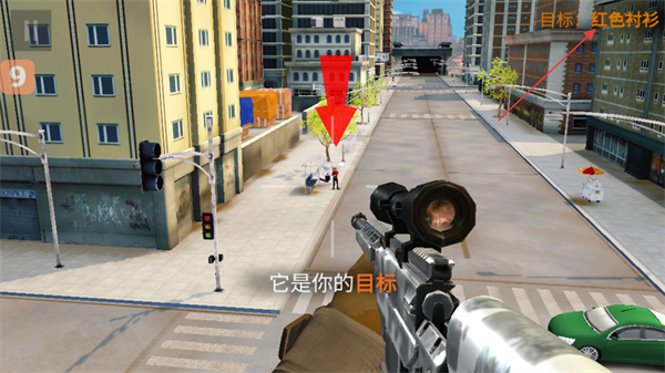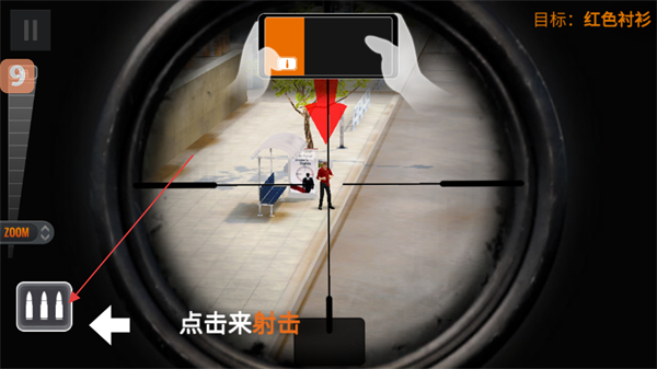 1、识别目标红色衬衫人物,用狙击枪瞄准。
