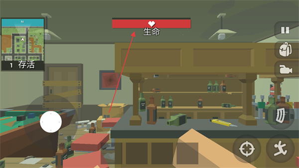 1、注意上方的生命条,在场景中搜索武器、道具,提升生存能力。