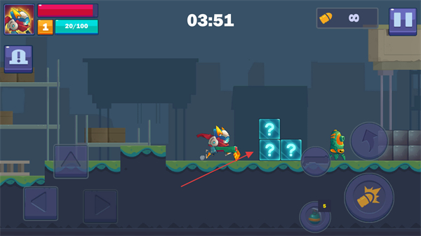 4、在前进过程中,遇到带有问号的方块,操控角色撞击获取道具或增益效果。