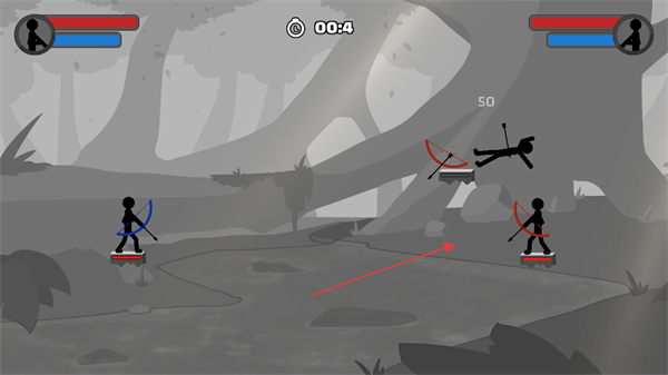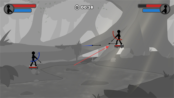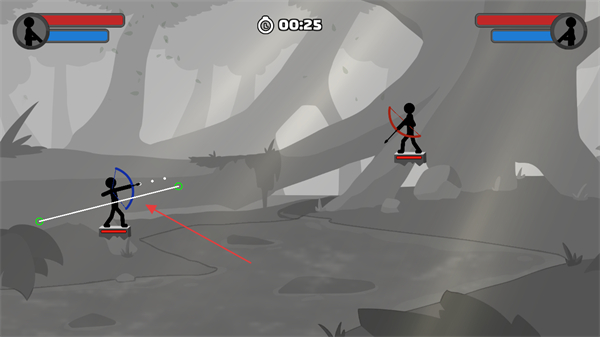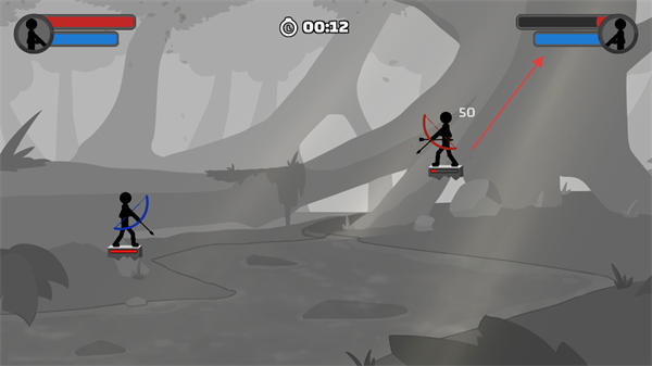 3、松开手指发射弓箭,攻击敌方火柴人,注意观察敌方血条变化。