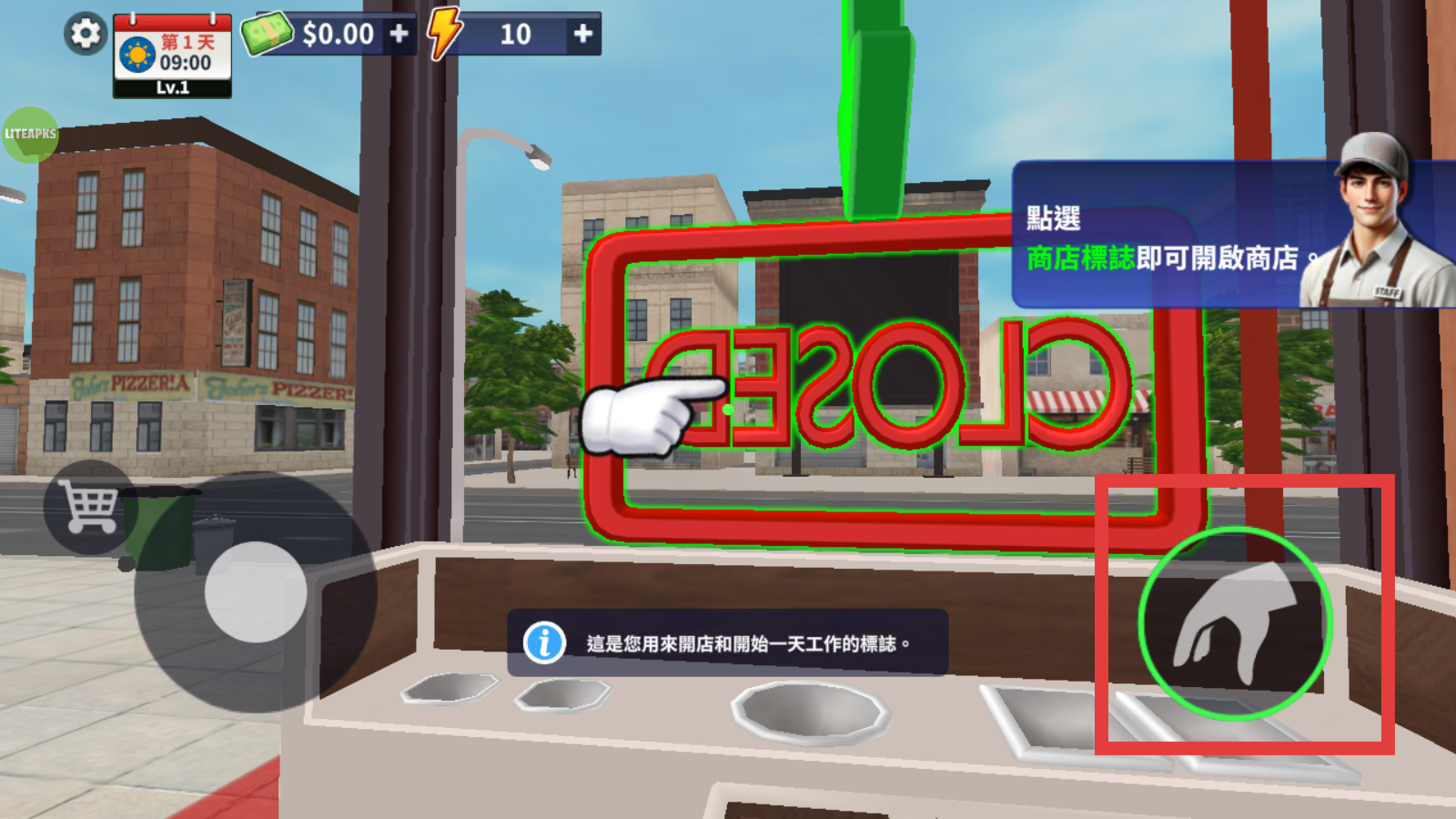 1、点击【CLOSED】商店标识,开启汉堡店,正式开始一天的经营工作,准备接待顾客。