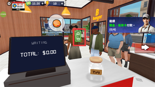 2、处理顾客的【现金】、【信用卡】付款,完成4次支付任务,积累经营收入,推进流程。