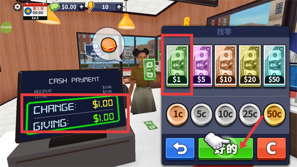 4、根据【CHANGE-$1.00】的金额,选择对应钱币,点击【好的】完成找零,确保交易无误。